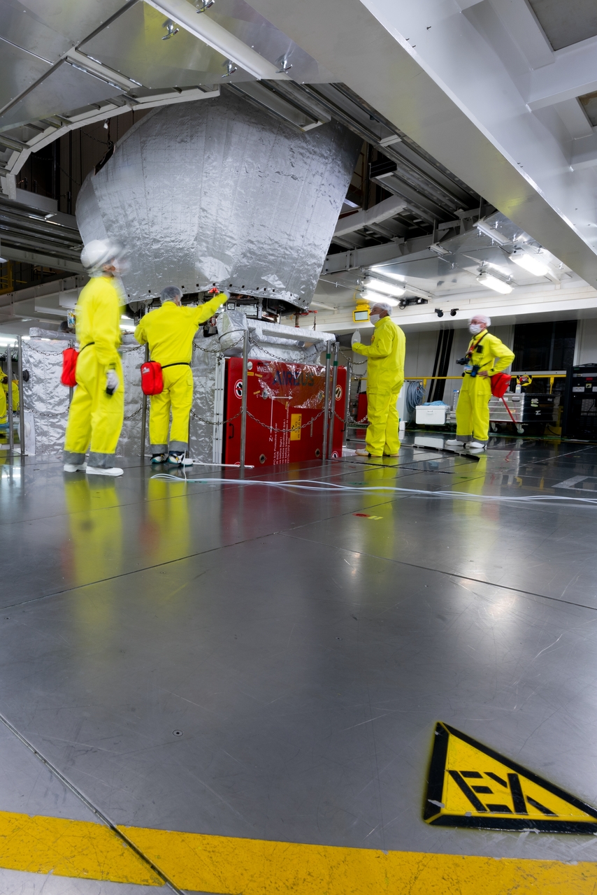 The sunshield unit is lowered over the BepiColombo spacecraft stack. It will protect JAXA's Mercury Magnetospheric Orbiter en route to Mercury.