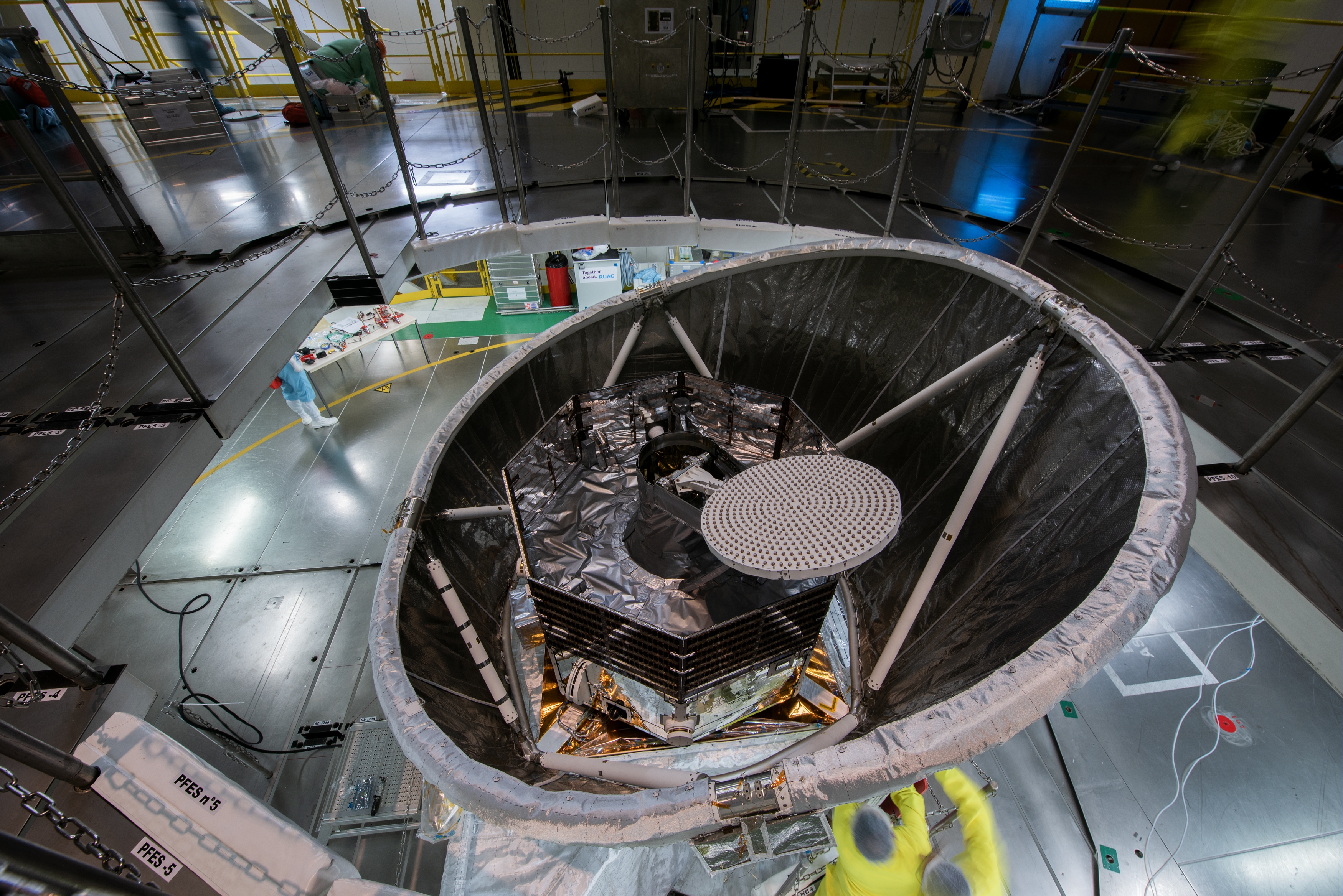 The full BepiColombo stack is complete with the addition of the sunshield that will protect JAXA's Mercury Magnetospheric Orbiter (MMO) en route to Mercury. The white dish on top of MMO is its deployable high-gain antenna.