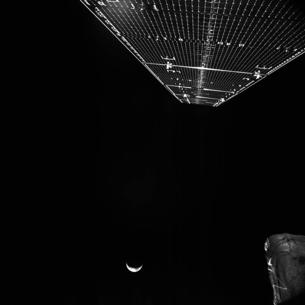 The image, showing Earth as a receding crescent against the darkness of space, was captured at 17:13 UTC on 10 April, around 218 000 km from Earth's surface, by one of the MCAM selfie cameras mounted on the Mercury Transfer Module (MTM), one of the three components of the BepiColombo mission. One of the solar arrays is visible on the right side of the images and the structure in the bottom corner is one of the sun sensor units on the MTM, covered in multi-layered insulation.
