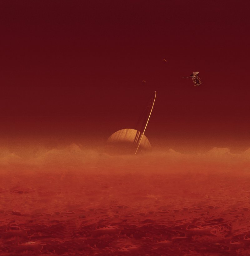 After entering orbit around Saturn in July 2004, the Cassini spacecraft will release the Huygens Probe in November 2004 for entry and descent through Titan's atmosphere. After the Probe's mission is completed, the Saturn Orbiter will make many close flybys of Titan to continue the global exploration of the moon during the nominal 4 year mission. In this artist's view, Saturn and two other moons are seen through Titan's hazy atmosphere.