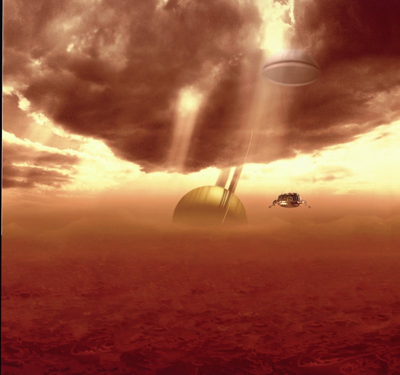 After entering Titan's atmosphere, Huygens' parachute system will be deployed for the 2-2½ hour descent, during which most of the scientific measurements will be made. This artist's impression shows the Probe suspended from the stabiliser parachute passing through the clouds that are expected at around 20 km altitude. The descent will occur during daylight to provide the best illumination conditions for imaging the clouds