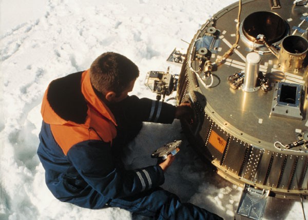 A full-size model of the Huygens Descent Module rests on the snow in Sweden in May 1995 after a successful drop test from high altitude. The Front Shield and Back Cover, which will protect the probe when it enters the atmosphere of Titan, separated correctly. A succession of parachutes then controlled the probe's descent, as they will do on Titan.