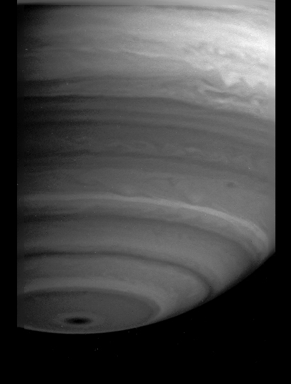 This image shows dramatic details in the swirling, turbulent bands of clouds in Saturn's atmosphere. Particularly noteworthy is the disturbed equatorial region. The image was taken with the Cassini narrow angle camera on 10 May 2004, in the spectral region where methane strongly absorbs light. It was taken at a distance of 27.2 million kilometres from Saturn. Image scale is 162 kilometres per pixel. Contrast in the image was enhanced to aid visibility.
