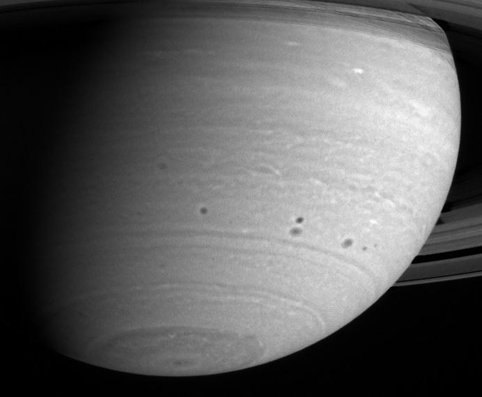 Cassini continues its vigil as Saturn's atmosphere churns and morphs through time. Four large, dark spots, or storms, form a symmetrical pattern in the mid-southern latitudes as these features squeeze past each other. Further observations will show whether these storms merge or spawn new spots of their own. North of the features, some latitudinal bands exhibit a bumpy or scalloped pattern, probably indicative of planet-scale wave motions in the atmosphere.