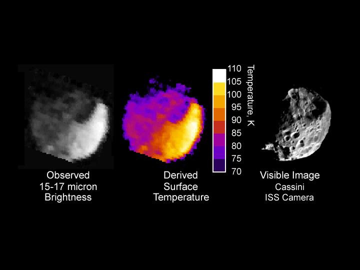 The left-hand panel displays the image in greyscale format, showing the brightness of Phoebe's radiation in the wavelength range 15-17 μm, which is about 25 times the longest wavelength visible to the naked eye. In the middle panel this brightness is used to estimate the surface temperature distribution across Phoebe. Temperatures are given in degrees Kelvin, and vary from a relatively toasty 107 K, in the late morning near the equator (white, lower right), to less than 75 K in the northern hemisphere in the pre-dawn hours (dark blue, upper left). The "ragged edge" of Phoebe in this region is an instrumental artefact.