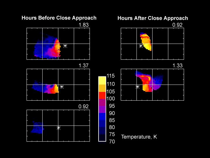 A montage of maps of Saturn's moon Phoebe shows surface temperatures at various times of the day as determined by the composite infrared spectrometer onboard Cassini during the 11 June 2004, Phoebe flyby. The asterisk on each map shows the location of the subsolar point, where the Sun is directly overhead. This point moves across the surface as Phoebe rotates. It is morning in regions to the left of the subsolar point, and afternoon in regions to the right.