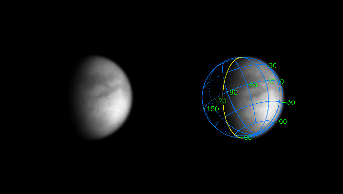 The superimposed coordinate system grid in the accompanying image at right illustrates the geographical regions of the moon that are illuminated and visible, as well as the orientation of Titan. North is up and rotated 25 degrees to the left. The yellow curve marks the position of the boundary between day and night on Titan. This image shows about one quarter of Titan's surface, from 0 to 70 degrees West longitude, and just barely overlaps part of the surface shown in the previous Titan image release. Most of the visible surface in this image has not yet been shown in any Cassini image.