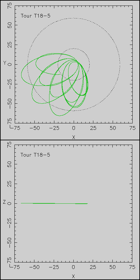 This plot gives the polar view (top) and edge-on view (bottom). In the polar view the inner dashed circle represents the orbit of Titan and the outer dashed circle represents the orbit of Iapetus. The scales on the axes are in Saturn radii.