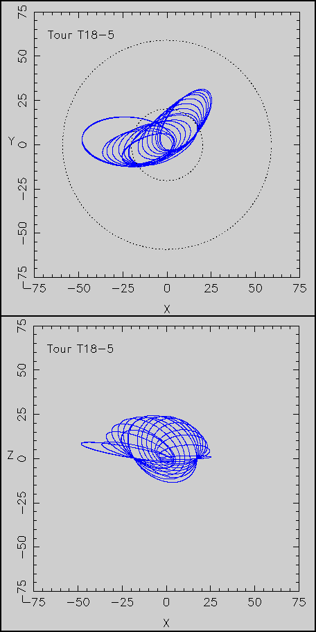 This plot gives the polar view (top) and edge-on view (bottom). In the polar view the inner dashed circle represents the orbit of Titan and the outer dashed circle represents the orbit of Iapetus. The scales on the axes are in Saturn radii.