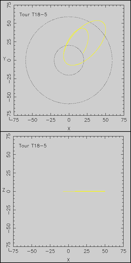 This plot gives the polar view (top) and edge-on view (bottom). In the polar view the inner dashed circle represents the orbit of Titan and the outer dashed circle represents the orbit of Iapetus. The scales on the axes are in Saturn radii.