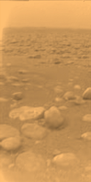 Initially thought to be rocks or ice blocks, the rock-like objects are more pebble-sized. The two objects just below the middle of the image are about 15 centimetres (left) and 4 centimetres (centre) across respectively, at a distance of about 85 centimetres from Huygens.