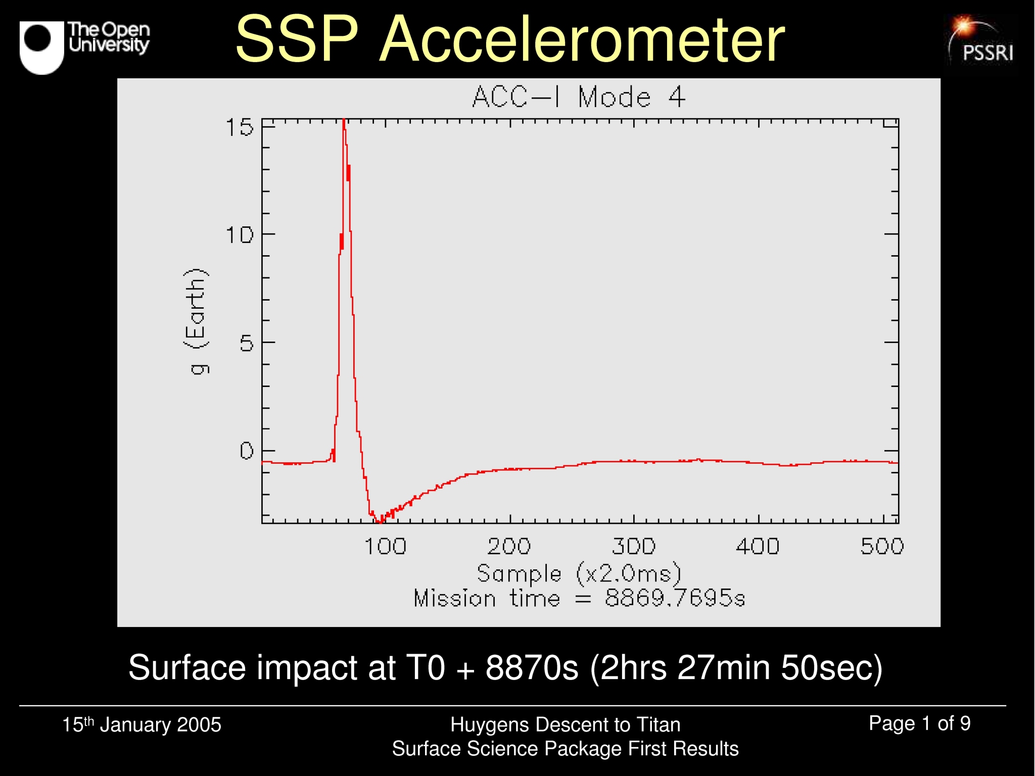 Data from the SSP Accelerometer showing the force experienced by Huygens as it landed on the surface.