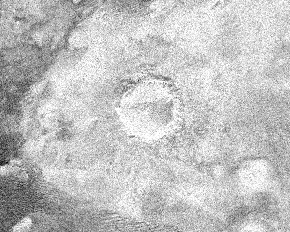 This image shows a crater, approximately 60 kilometres in diameter, on the very eastern end of the radar image strip taken by the Cassini orbiter on its third close flyby of Titan on 15 February 2005.