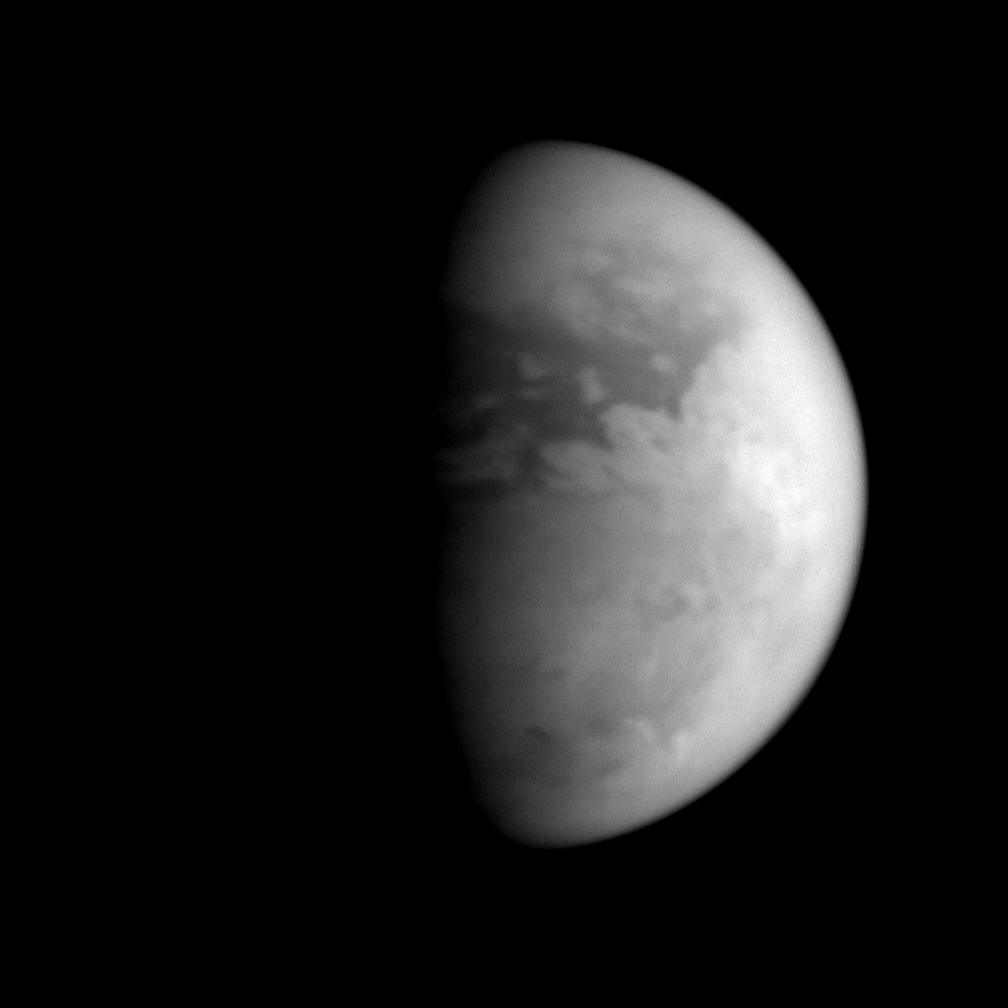 Near the moon's south pole, and just eastward of the terminator, is the dark feature identified by imaging scientists as the best candidate (so far) for a past or present hydrocarbon lake on Titan. Farther east of the lake-like feature, bright clouds arc around the pole. These clouds occupy a latitude range that is consistent with previously-seen convective cloud activity on Titan.