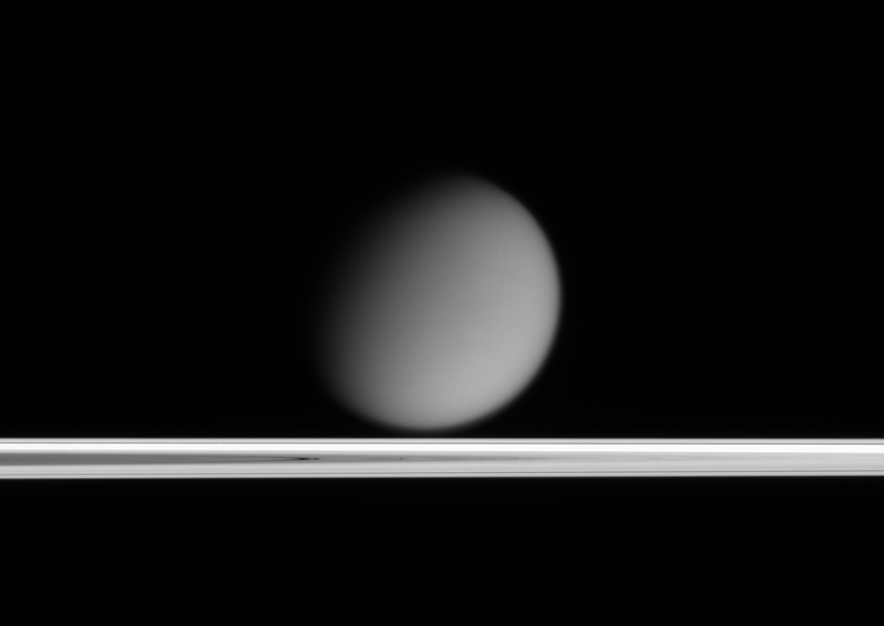 The Sun is below the rings in this image, so light that makes it to Cassini is that which has been diffusely transmitted through the rings. Thus, the densest parts of the rings appear dark in this image, and the dusty gaps in the rings, such as the Cassini Division, appear bright.