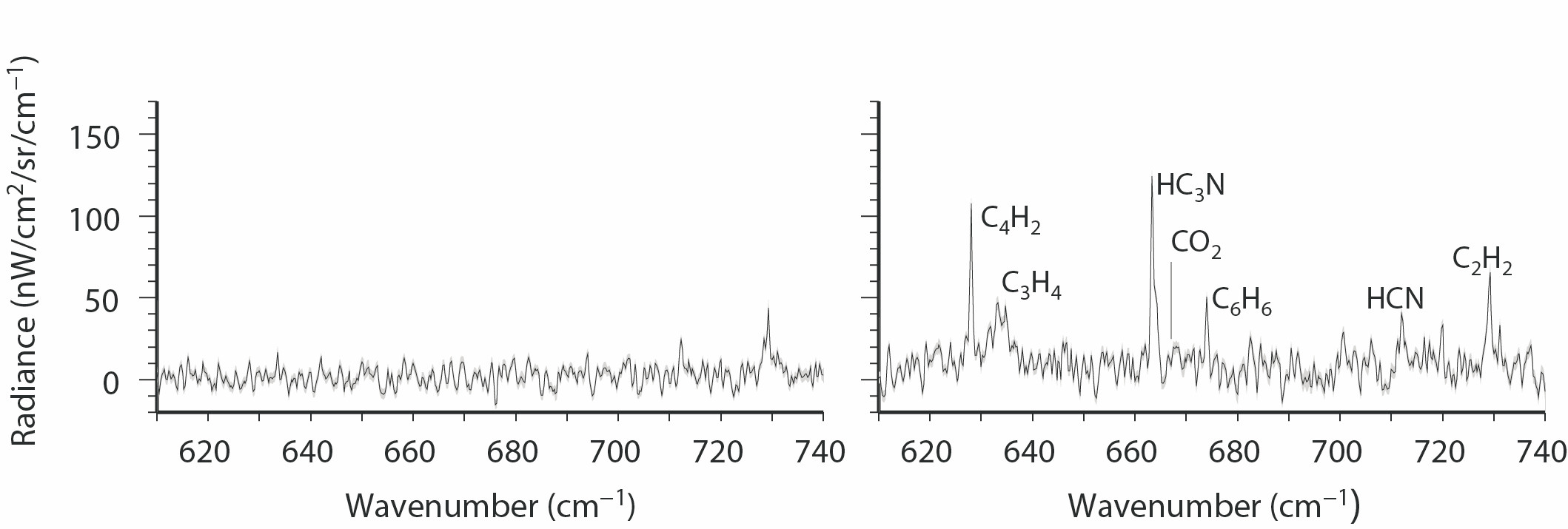 A number of trace compounds were detected: diacetylene (C4H2), methylacetylene(C3H4), cyanoacetylene (HC3N), carbon dioxide (CO2), benzene (C6H6), hydrogen cyanide (HCN) and acetylene (C2H2).