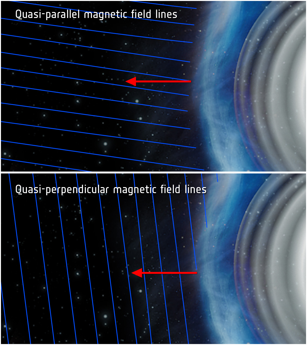 Illustration of quasi-parallel (top) and quasi-perpendicular (bottom) magnetic field conditions at a planetary bow shock. Under quasi-parallel conditions, the magnetic field is roughly pointing toward the shock surface, almost parallel to a vector at right angles to the shock front (red arrow). Under quasi-perpendicular conditions, the magnetic field is close to aligned with the shock surface, that is, almost perpendicular to the shock vector.