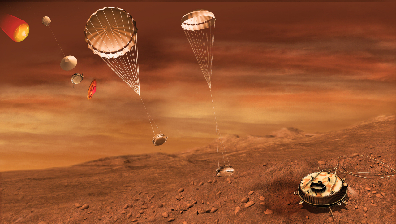 This image is an artist's impression of the descent and landing sequence followed by ESA's Huygens probe that landed on Titan on 14 January 2005. The event was the culmination of a 22-year process of planning, organising and cooperation between ESA and NASA.
