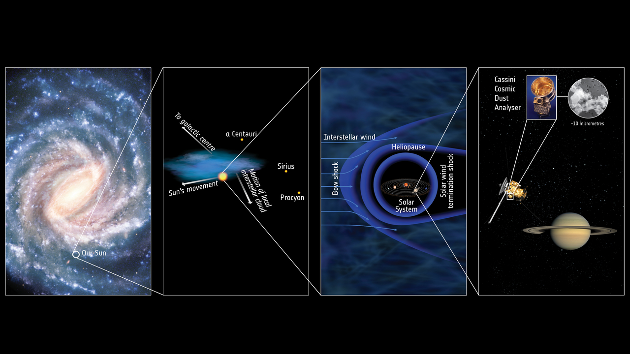 This graphic summarises the location of Saturn, and the Solar System, with respect to the local interstellar cloud, and our place in the Milky Way galaxy.