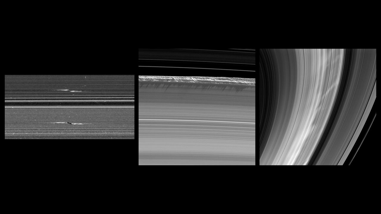 Middle: the exquisite detail of vertical structures in the rings was revealed at equinox. They are driven by gravitational perturbations of nearby moons, with the peaks rising to about 2.5 km above the plane of the rings. The image shows a 1200 km long section imaged on 26 July 2009, and the image scale is 2 km/pixel. Original image.