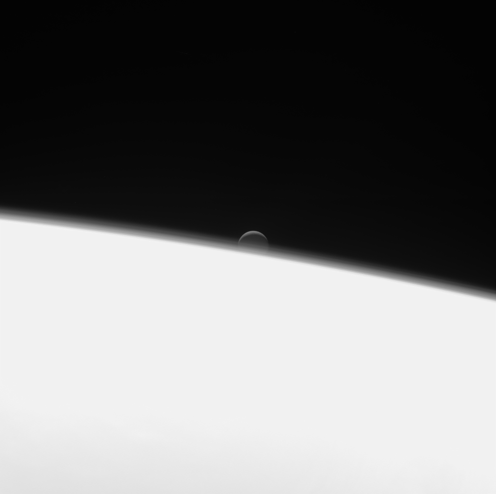 Enceladus setting behind Saturn – monochrome