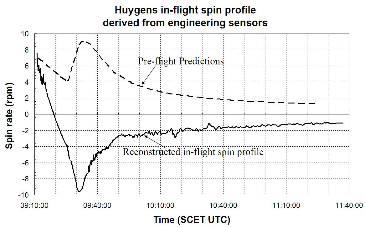 As part of the international Cassini mission, Huygens made history when it became the first probe to successfully land on another world in the outer Solar System. However, during its descent, the probe began spinning the 'wrong' way – as this graph illustrates. Huygens was released from the Cassini orbiter spinning anti-clockwise at a rate of 7.5 rotations per minute. This direction of spin was intended to continue throughout the descent, with the spin rate controlled and influenced by the deployment of landing parachutes.