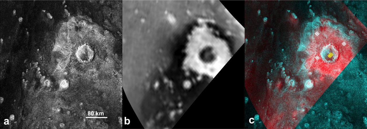 Sinlap is thought to be the youngest crater on Titan. The RADAR image of Sinlap is shown in (a), the VIMS image in (b), and the two are combined in (c) with yellow areas selecting the crater floor and white areas the ejecta blanket. The data from these areas were used in a recent study of crater composition and evolution on Titan.