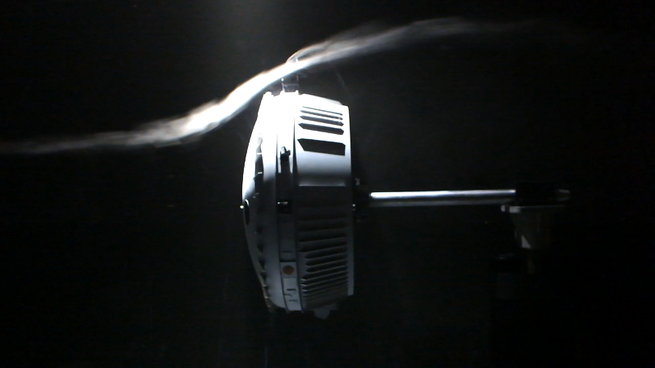 The image, produced in the wind tunnel at the PRISME Laboratory at the University of Orléans, France, shows how air flows across a 1:3 scale replica of Huygens – as visualised using white smoke. It was taken as part of subsonic testing performed from 2017 to 2019 to determine how ESA's Huygens probe spun during its descent to Titan.