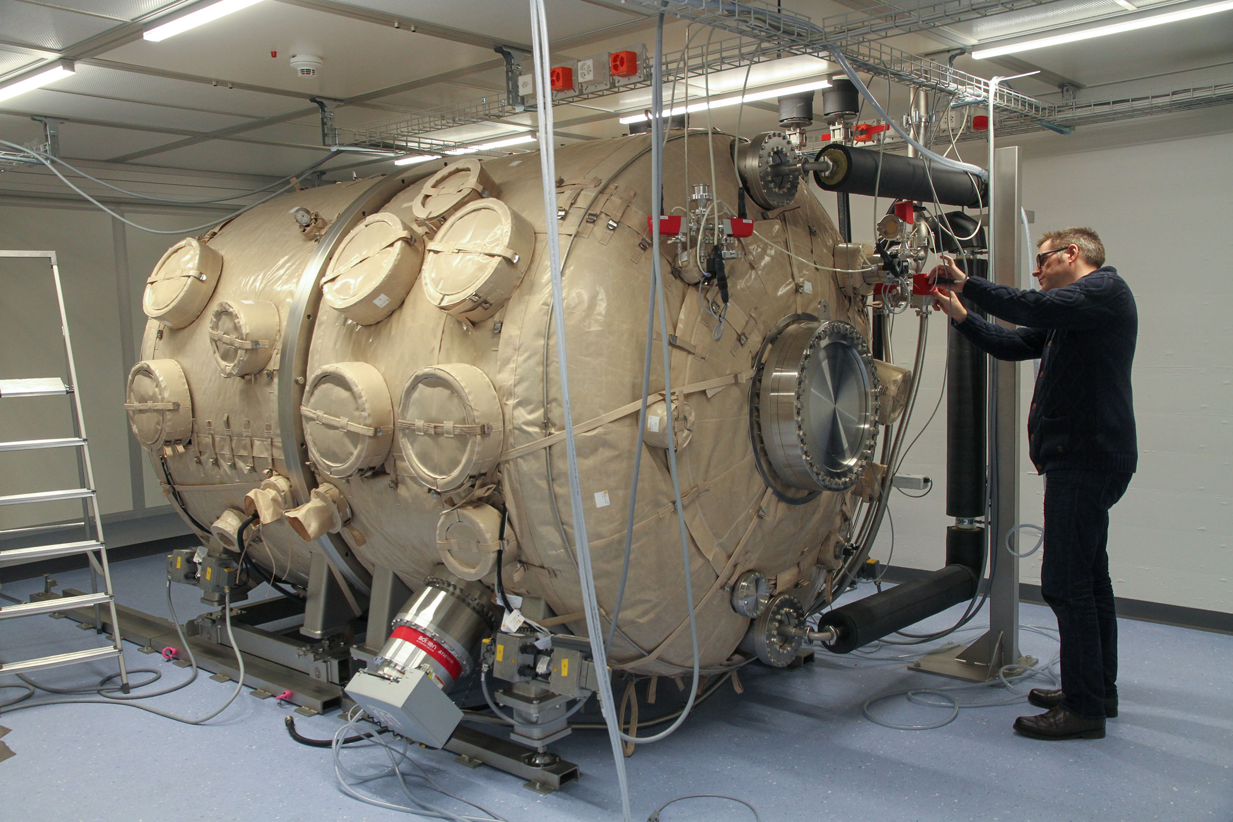 Christopher Broeg, the CHEOPS Consortium Project Manager, standing next to the vacuum chamber that will be used to test, qualify and calibrate the payload and constituent components for the CHaracterising ExOPlanet Satellite (CHEOPS). The chamber was installed at the Center for Space and Habitability (CSH), University of Bern, Switzerland, in February 2015.