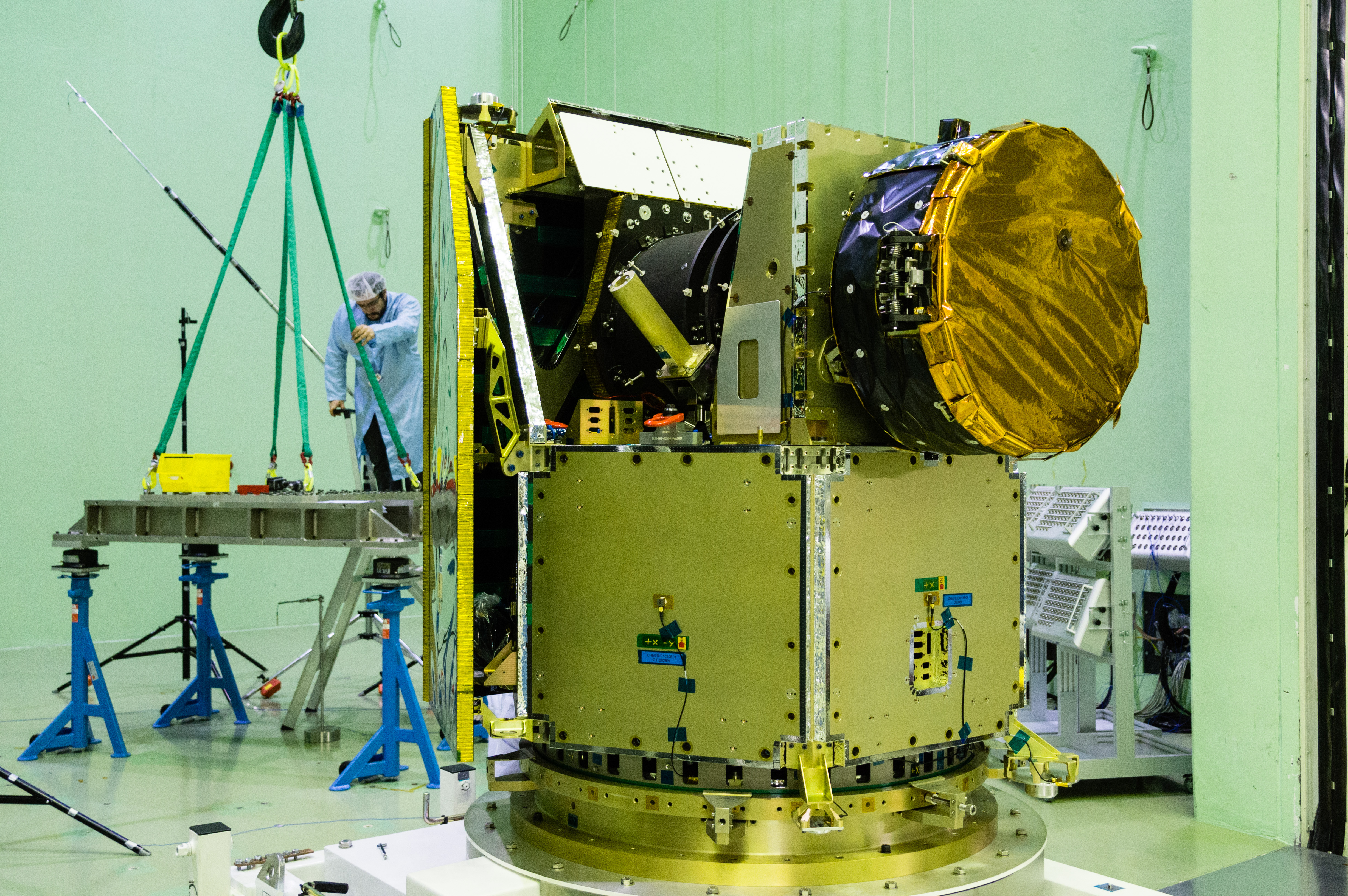 The CHEOPS spacecraft on its ground support trolley, shortly before being placed in the Large European Acoustic Facility (LEAF) test chamber at ESA's European Space Research and Technology Centre (ESTEC) in Noordwijk, the Netherlands, on 5 November 2015.