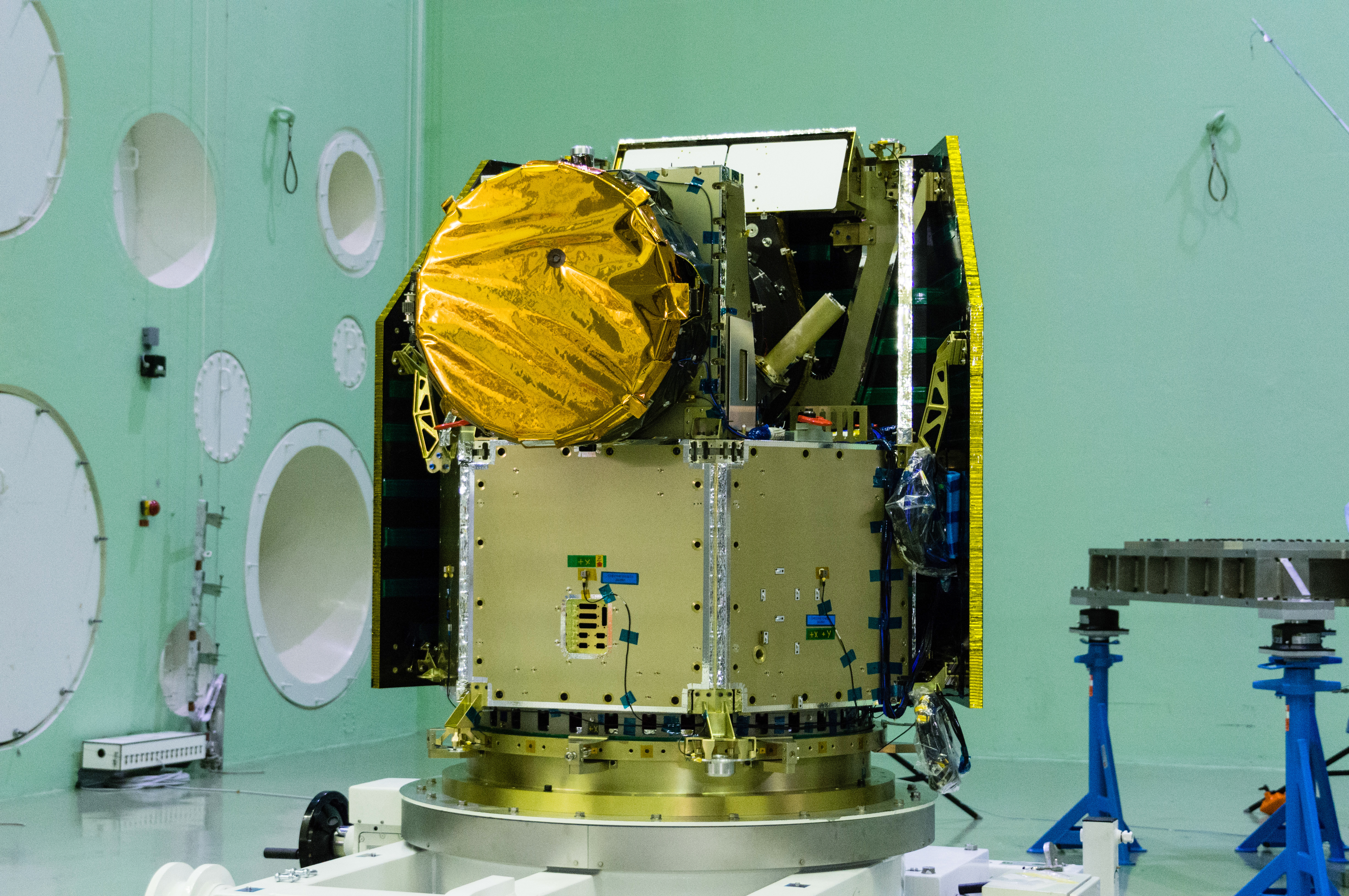 The CHEOPS spacecraft on its ground support trolley, shortly before being placed in the Large European Acoustic Facility (LEAF) test chamber at ESA's European Space Research and Technology Centre (ESTEC) in Noordwijk, the Netherlands, on 5 November 2015.