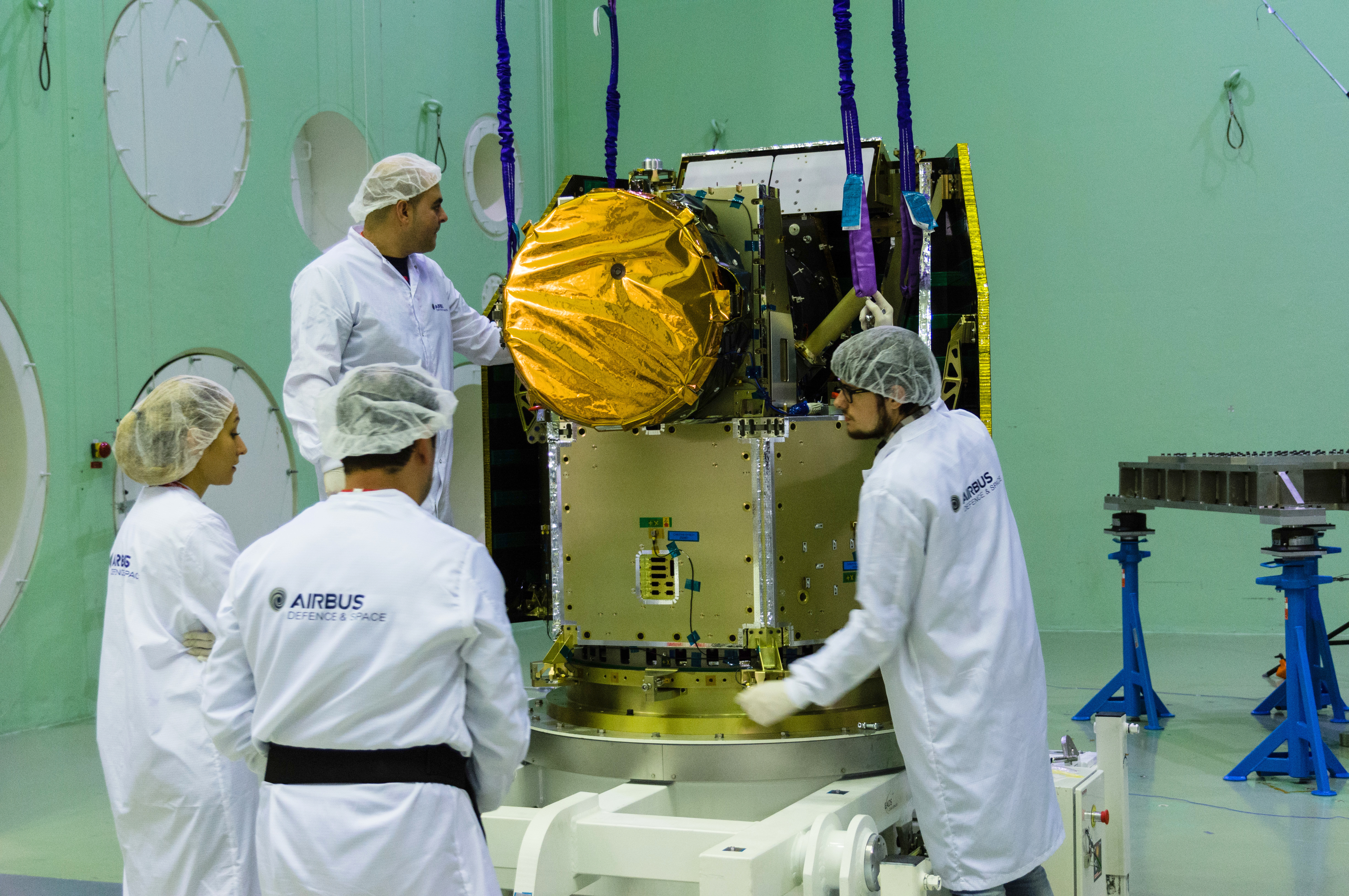 The CHEOPS spacecraft being lifted from its ground support trolley to be placed in the Large European Acoustic Facility (LEAF) test chamber at ESA's European Space Research and Technology Centre (ESTEC) in Noordwijk, the Netherlands, on 5 November 2015.