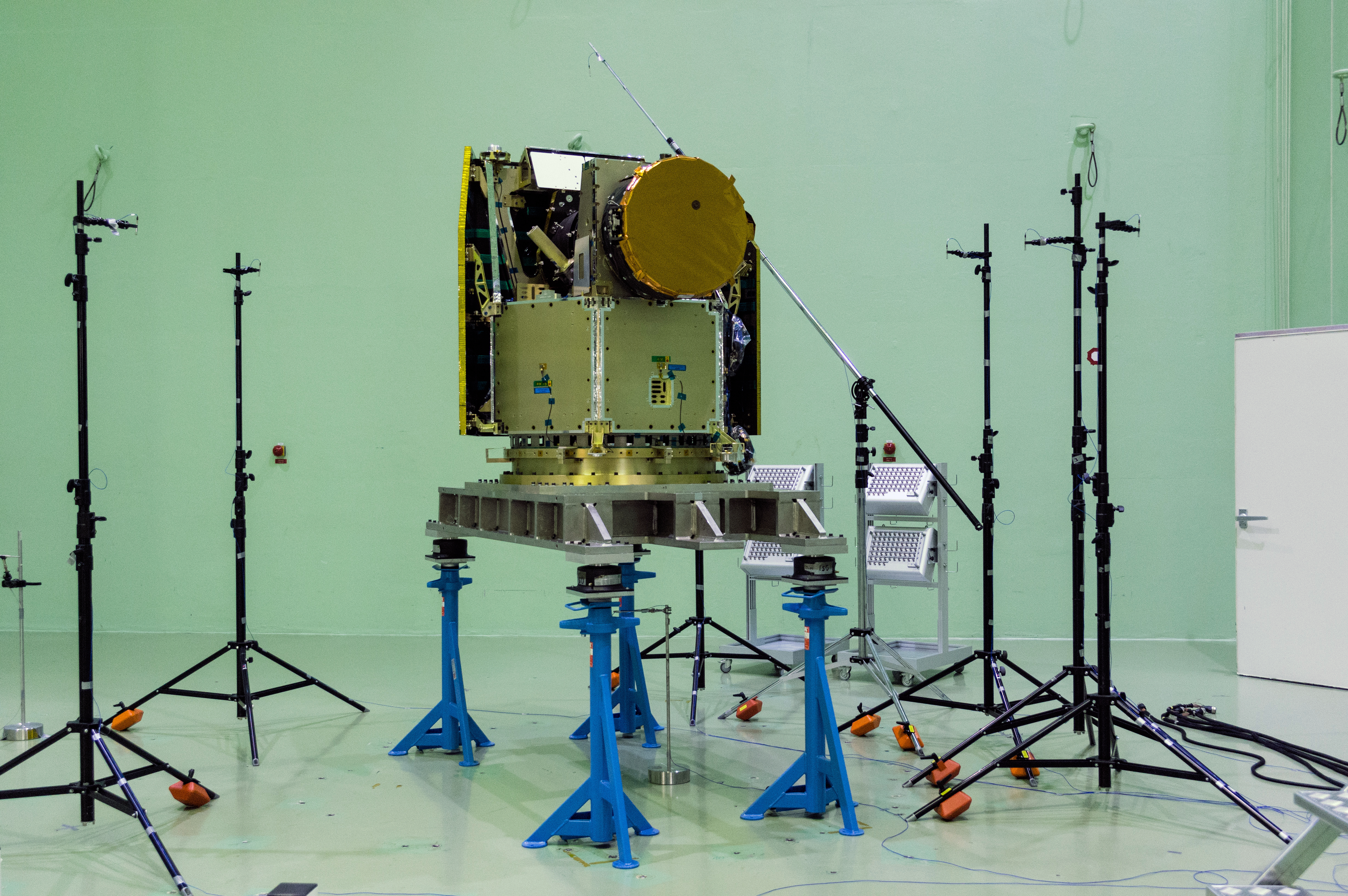 The CHEOPS spacecraft on a ground support structure inside the Large European Acoustic Facility (LEAF) test chamber at ESA's European Space Research and Technology Centre (ESTEC) in Noordwijk, the Netherlands, on 5 November 2015.