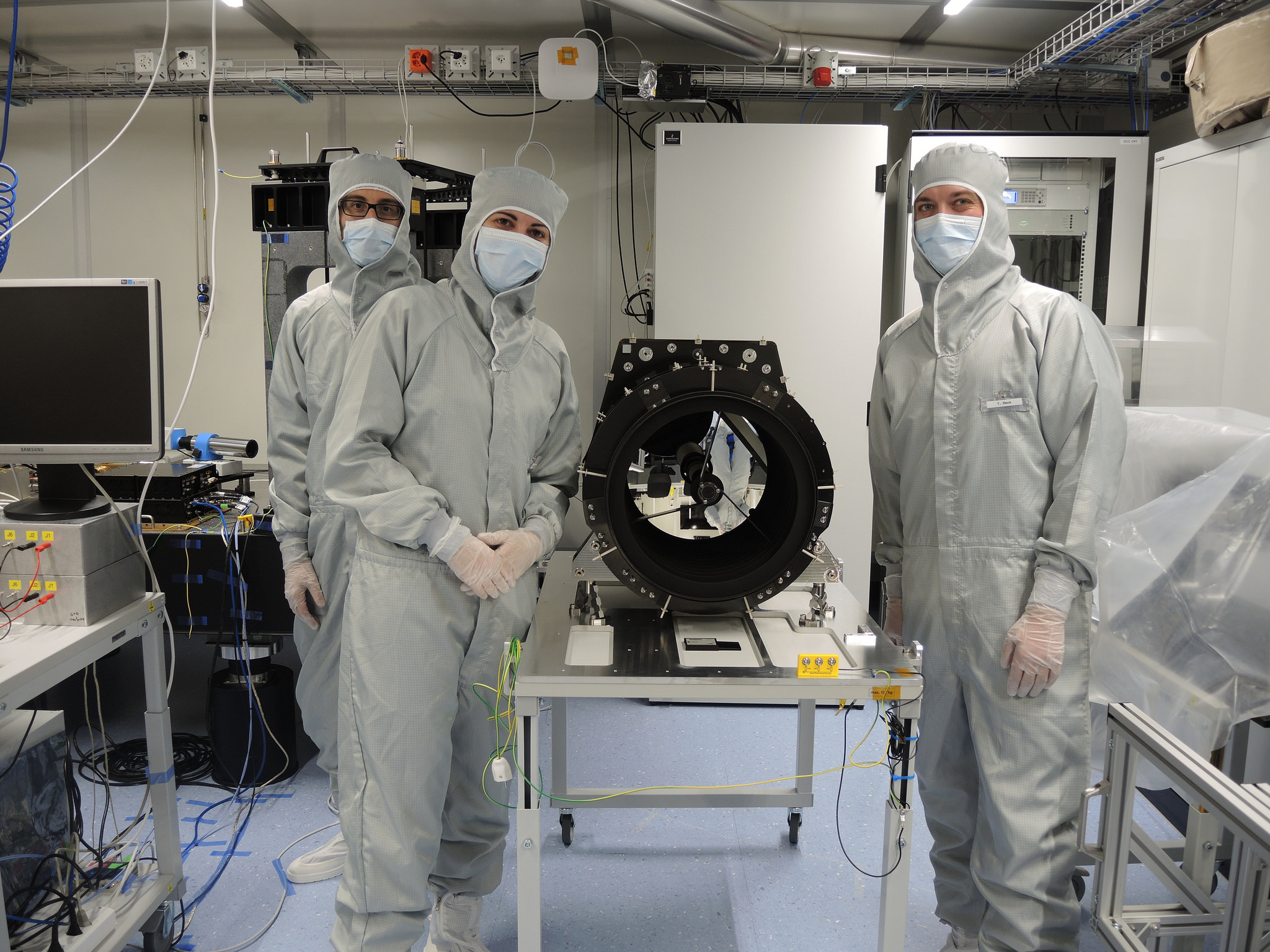 On 28 April 2017, the CHEOPS telescope flight model was delivered to the University of Bern by Leonardo-Finmeccanica, on behalf of the Italian Space Agency (ASI) and the Italian National Institute for Astrophysics (INAF). It is pictured here in its new home.