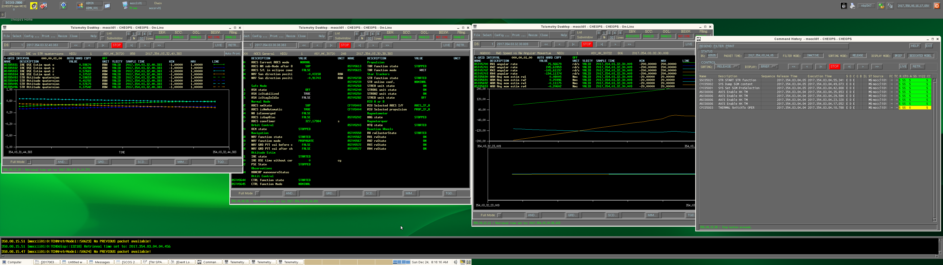 A screenshot of the Mission Control System (MCS) software used at the CHEOPS Mission Operations Centre (MOC) at Spain's National Institute for Aerospace Technology (INTA) in Torrejón. The software allows the MOC operators to monitor the spacecraft telemetry, which includes parameters for the star tracker (STR) and the magnetometer (MAG) sensors and the reaction wheel (RW) and Magentorquer (MTQ) actuators that are used by the Attitude and Orbit Control System (AOCS) to steer the spacecraft.