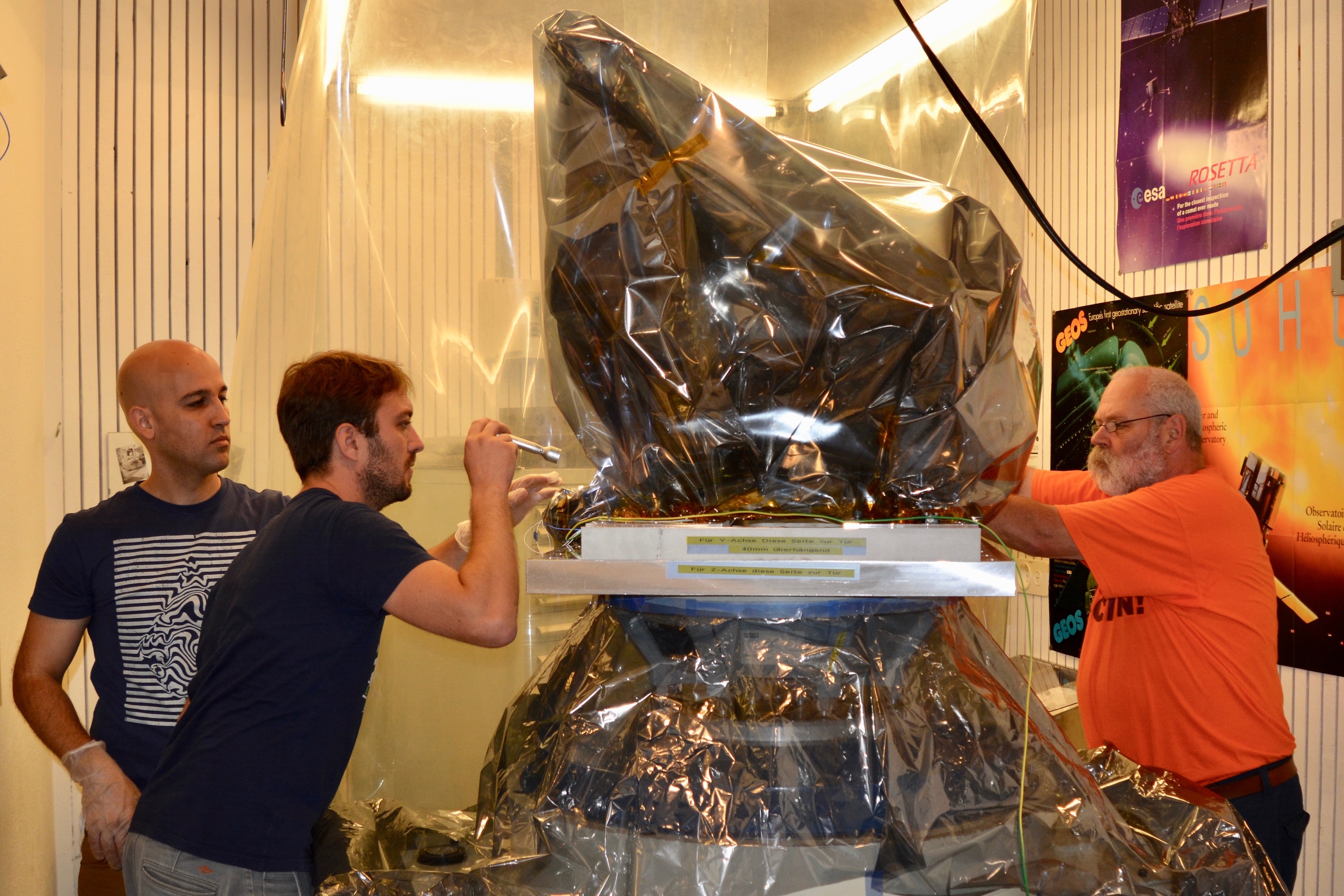Eduardo Hernández, Thomas Beck, and Daniel Schaedeli prepare the CHEOPS telescope for vibration tests on a shaker at the University of Bern, Switzerland, in August 2017.