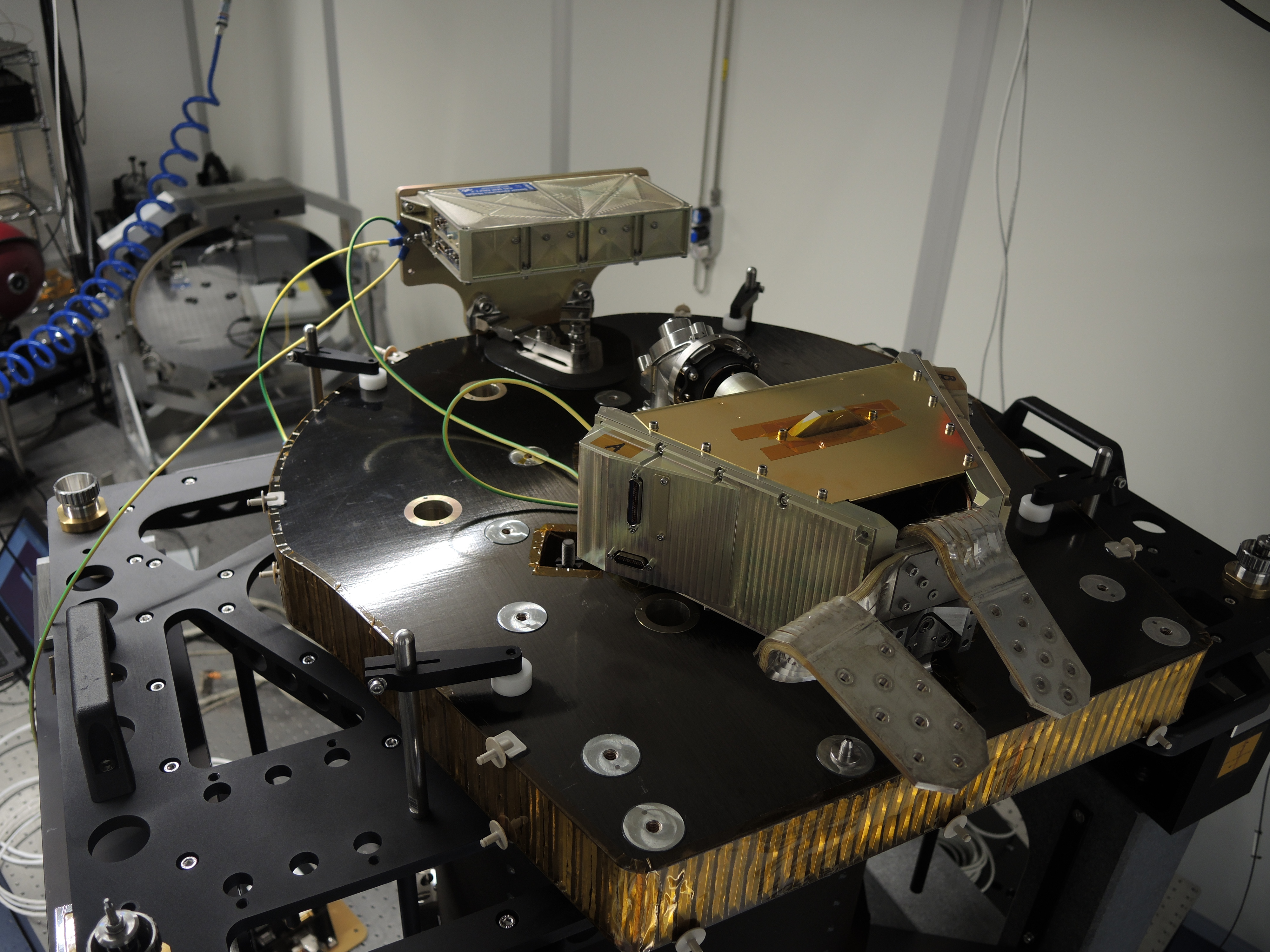 The bronze-coloured Focal Plane Module (FPM), which houses the CCD detector array and the Front-End Electronics, is seen here mounted on the flat, black optical bench at the rear of the downward-pointing telescope tube (not seen). The FPM is the detector system that captures the image from the telescope.
