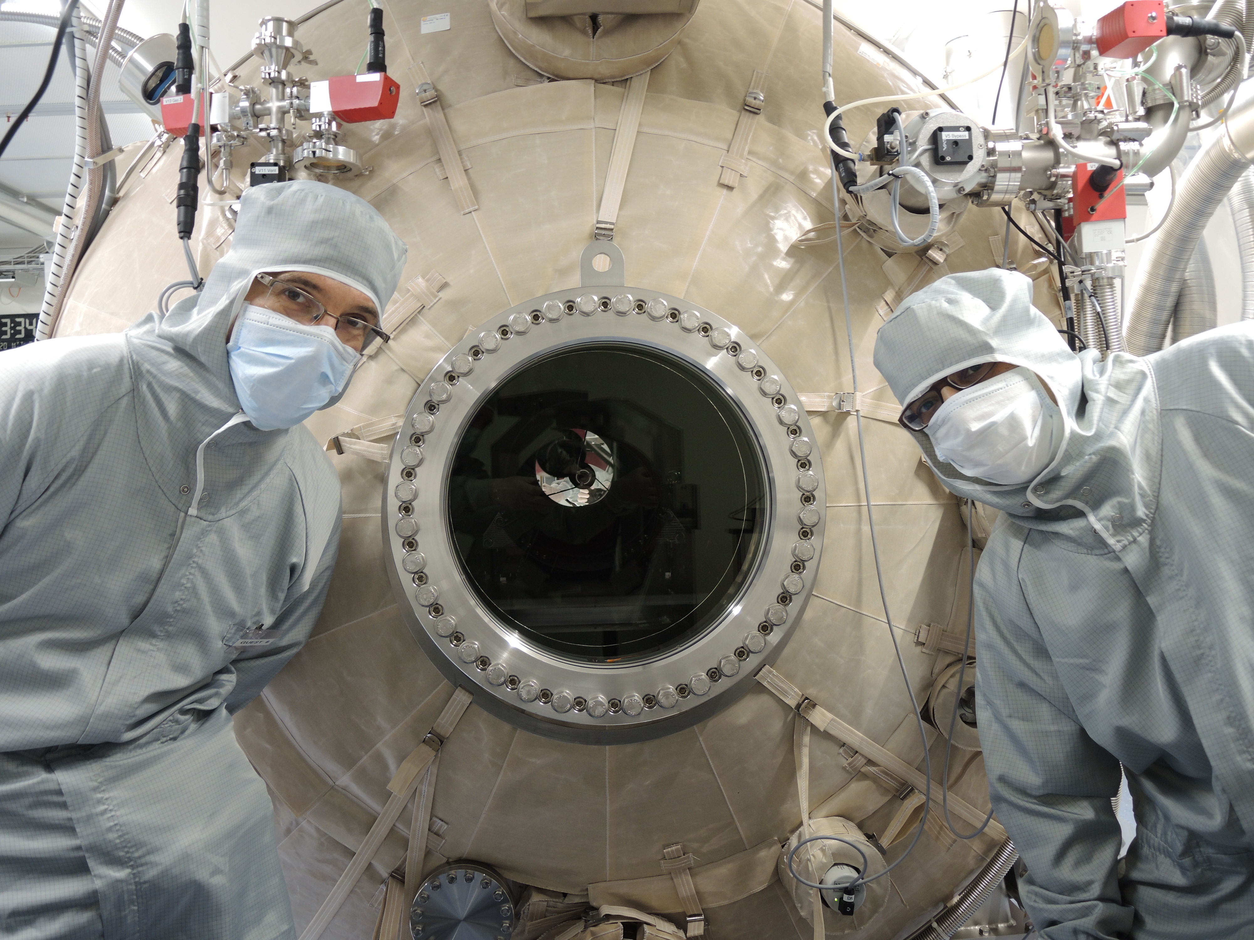The primary mirror of the telescope can be seen through the window in the sealed chamber. By accurately measuring how the image of a star-like light source changed as the instrument was cooled, it was possible to evaluate the accuracy of the in-orbit alignment.