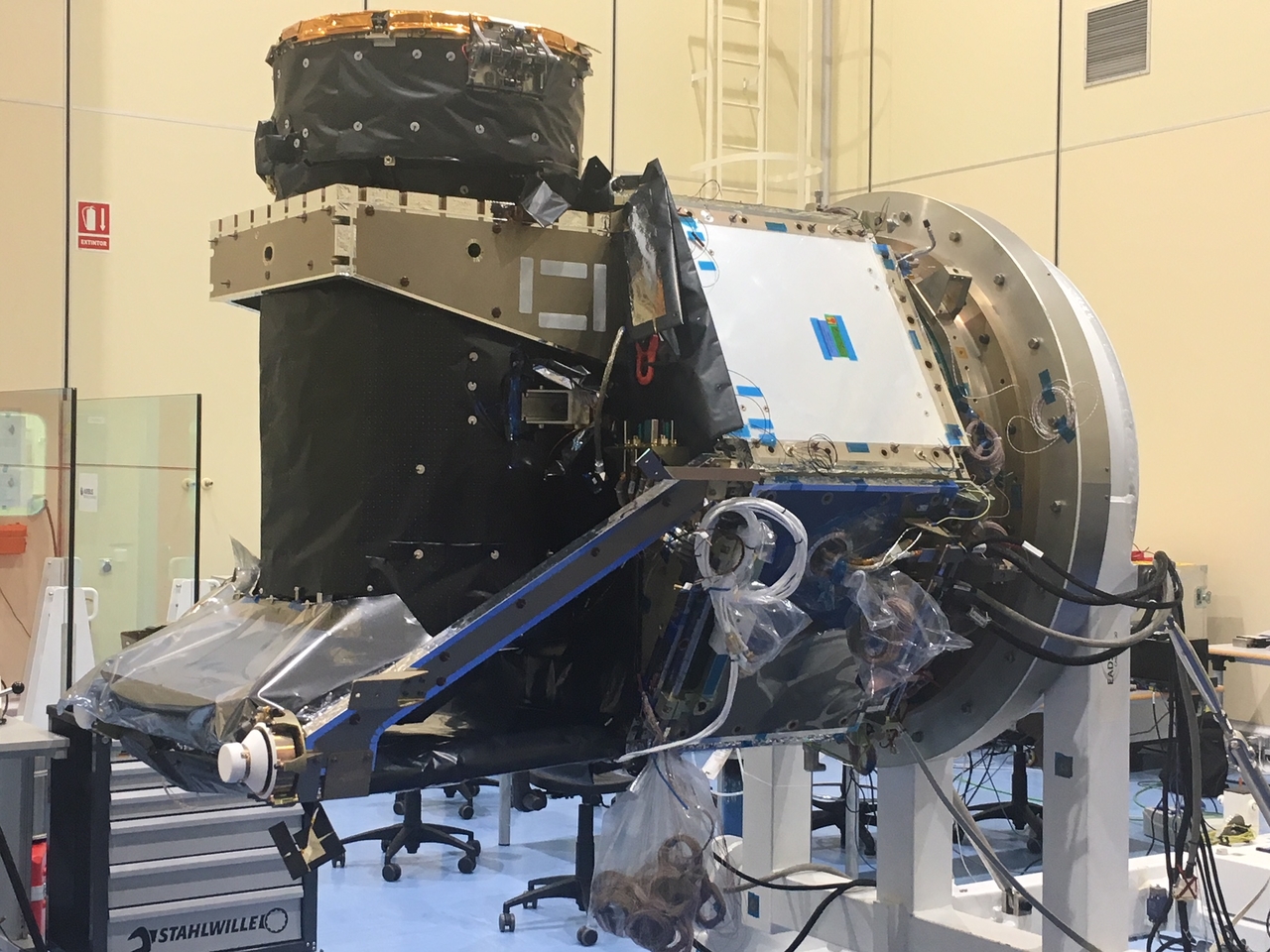 The CHEOPS spacecraft during baffle cover alignment