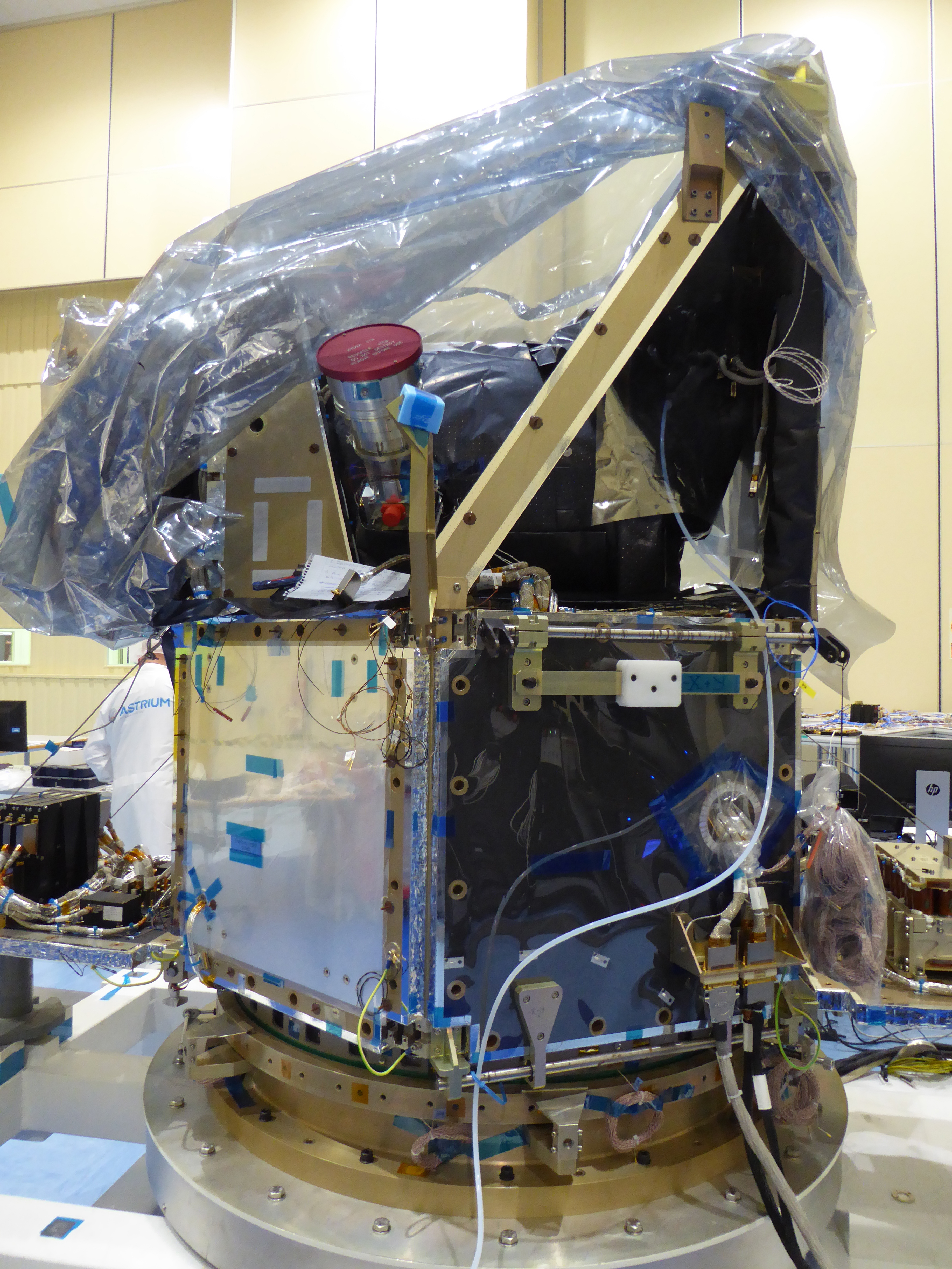 In this image, the protective plastic cover atop the spacecraft has been lifted to reveal one side of the science instrument and one of the star trackers (with a red cap). The thin, blue tube, seen rising from the bottom of the image and curving up to the top of the spacecraft, carries a steady stream of nitrogen gas that keeps the science instrument at a slightly higher pressure than the rest of the cleanroom, so that no dust can enter and contaminate the optical elements.