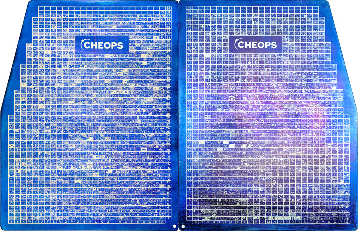 Two titanium plaques etched with thousands of miniaturised drawings made by children have been fixed to the CHaracterising ExOPlanets Satellite, CHEOPS. Each plaque measures nearly 18 cm across and 24 cm high.