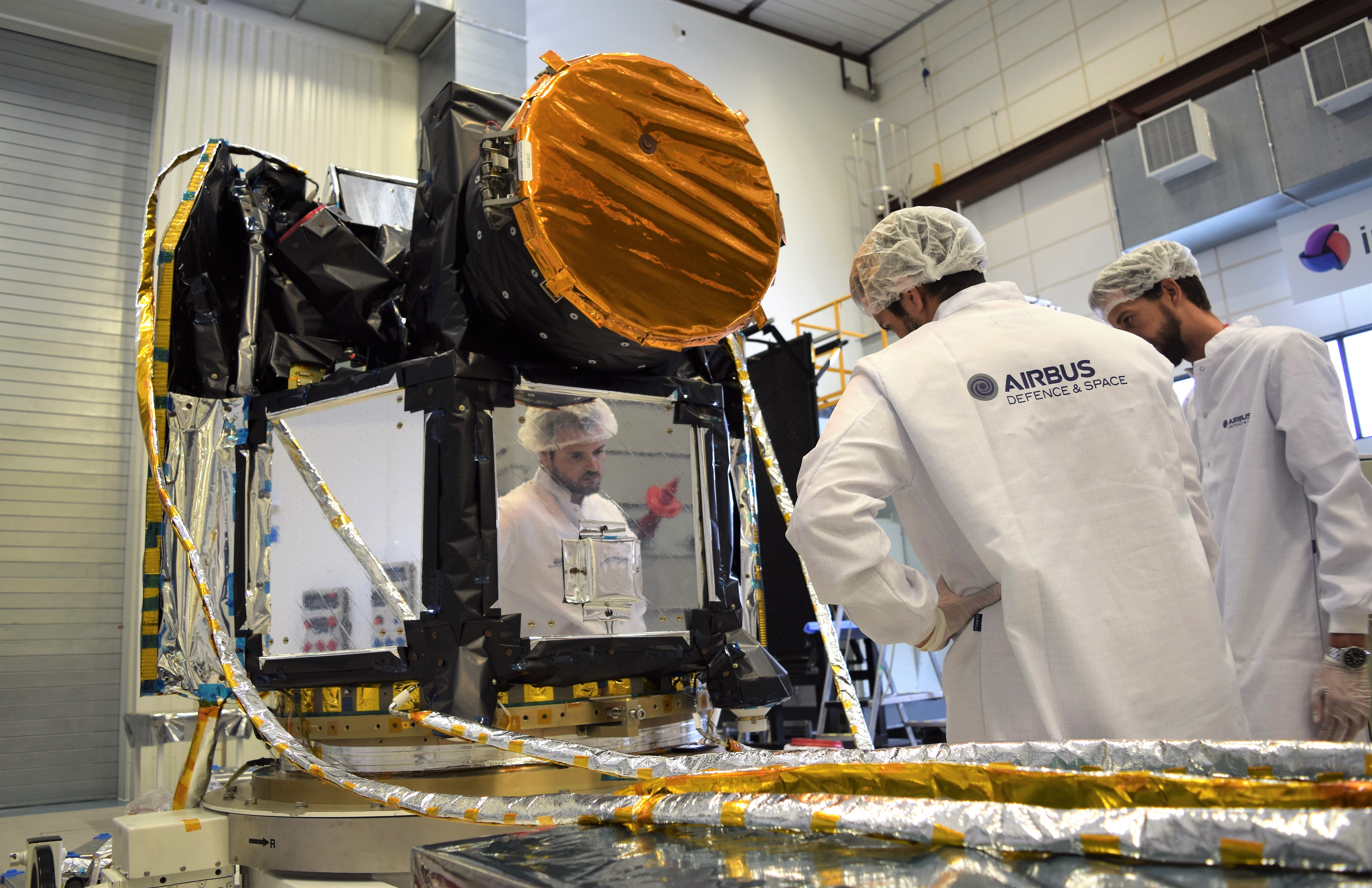 Depicts: Engineers inspecting the CHEOPS satellite