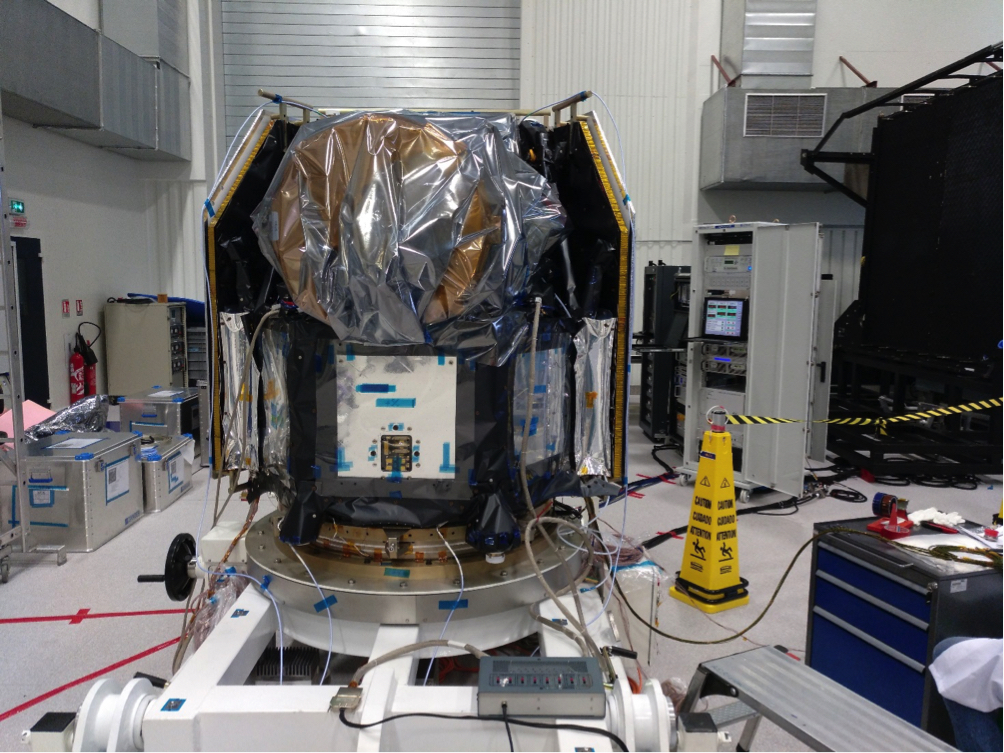 The fully integrated CHEOPS satellite before starting the thermal-vacuum tests in the cleanroom at the Airbus Engineering Validation Test facility in Toulouse, France. More than a hundred sensors were used to monitor temperature changes on different parts of the satellite during the tests.