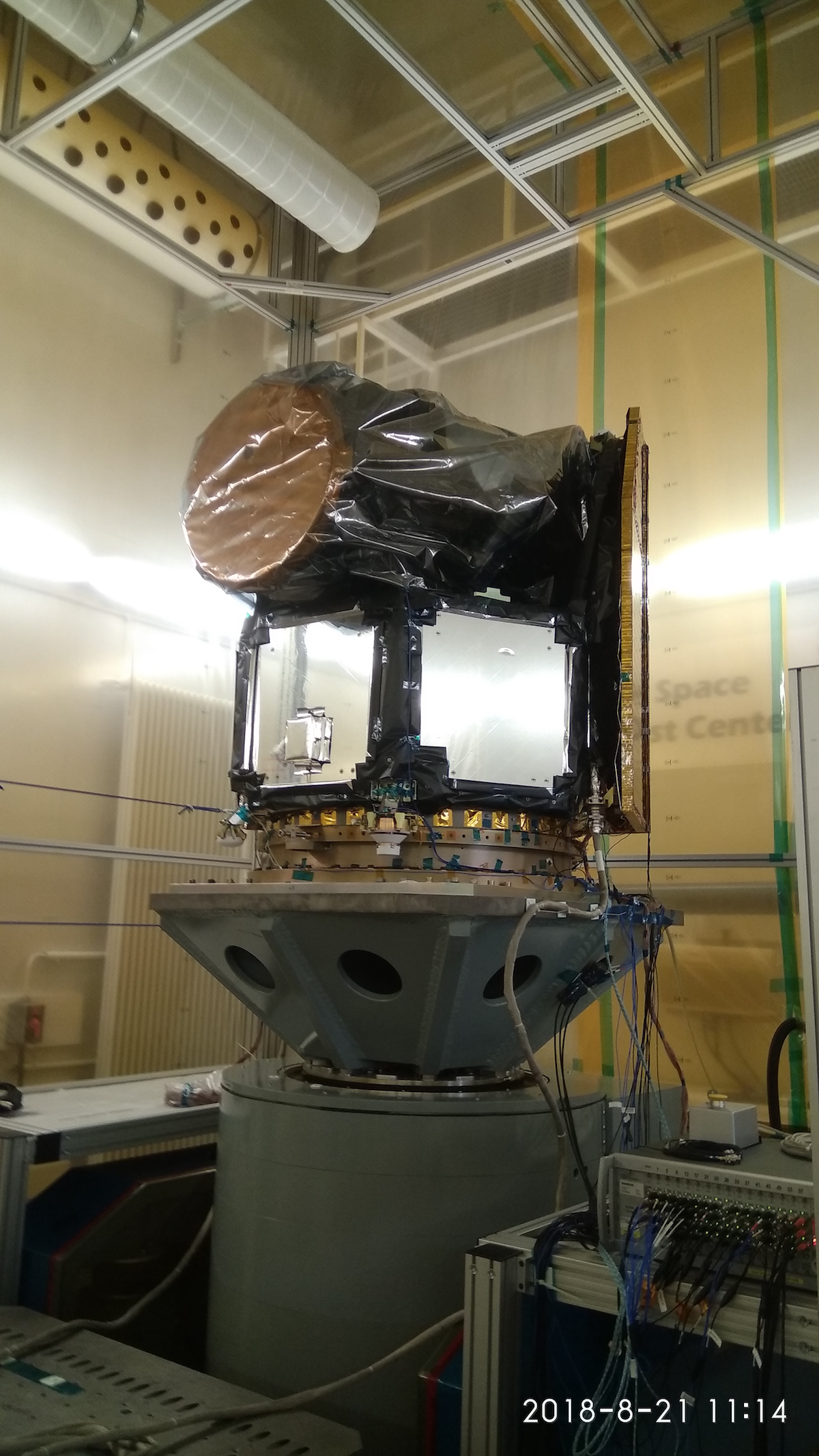 During vibration testing performed at RUAG Space in Zurich, Switzerland, the CHEOPS satellite was shaken longitudinally (end-to-end) and in two lateral directions (side-to-side). Here, CHEOPS is mounted on a longitudinal shaker with the science instrument protected by a dust cover. A range of vibrational frequencies was tested and the strength of vibration at each frequency was carefully chosen using numerical simulations that modelled the response of the satellite when coupled to the launch vehicle.