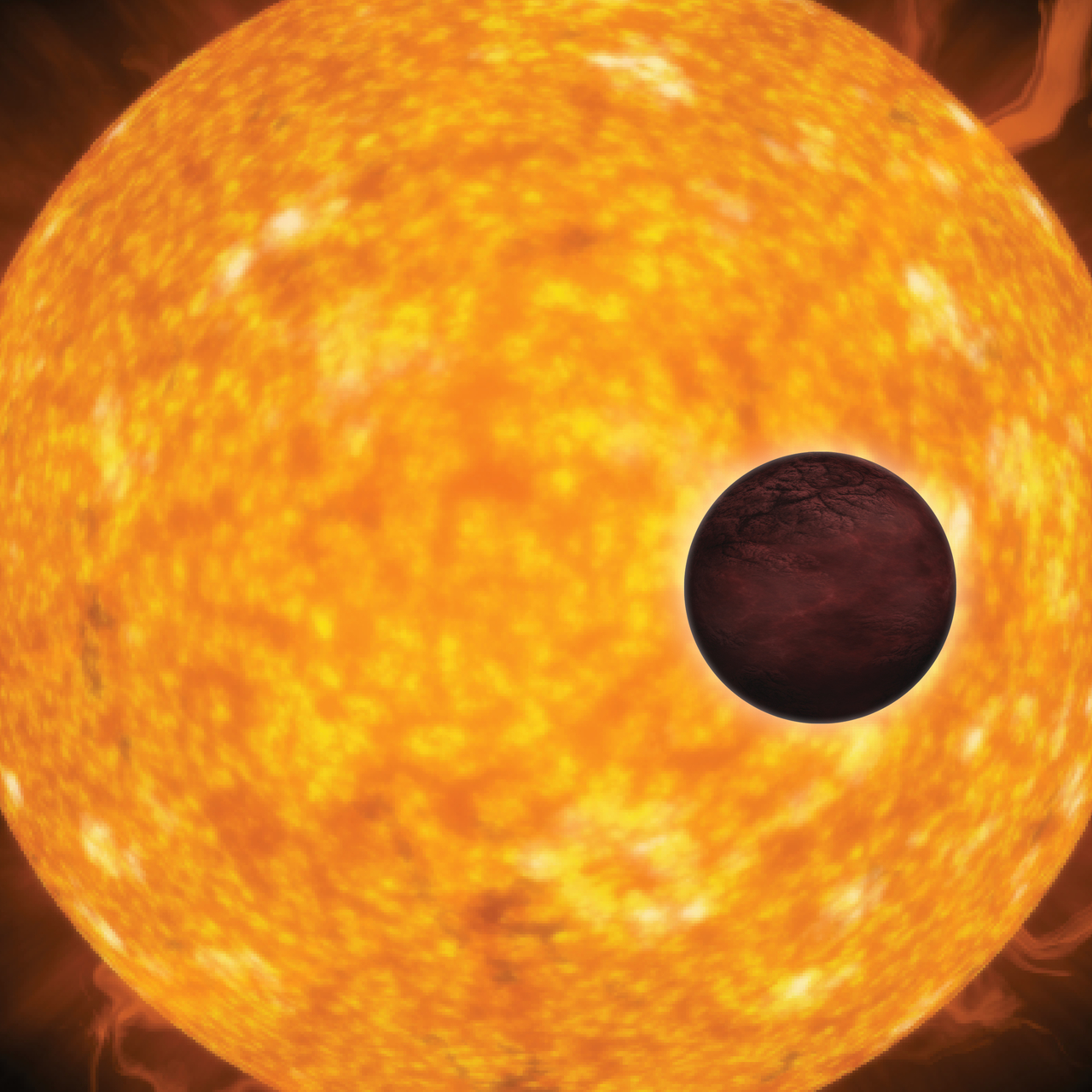 Artist's impression of a small, rocky planet – perhaps one flooded with lava – transiting across the face of its parent star.
