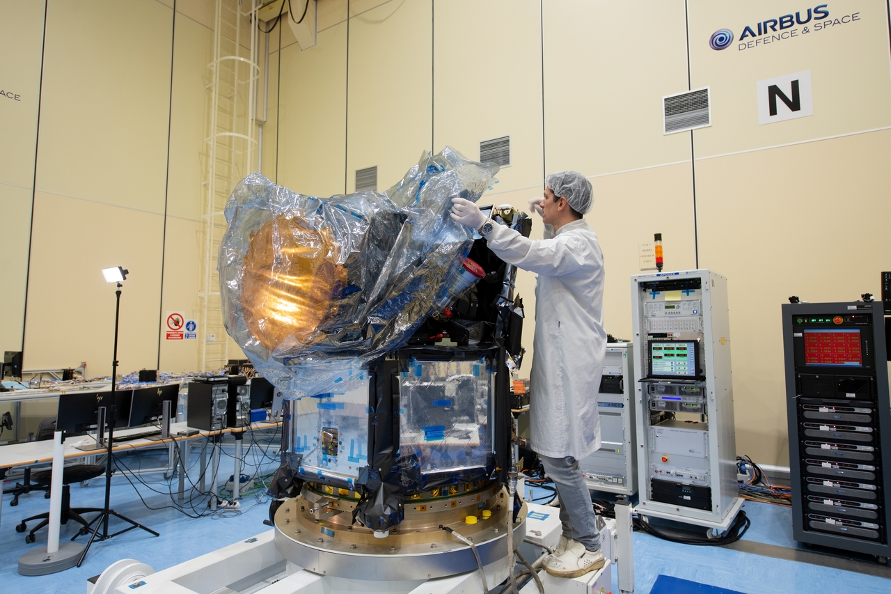 The CHaracterising ExOPlanet Satellite, CHEOPS, in the clean room at Airbus Defence and Space Spain, Madrid, in February 2019. The satellite was declared ready to fly and will target the period between 15 October and 14 November for launch. CHEOPS will make observations of exoplanet-hosting stars to measure small changes in their brightness due to the transit of a planet across the star's disc, targeting in particular stars hosting planets in the Earth-to-Neptune size range. The information will enable precise measurements of the sizes of the orbiting planets to be made: combined with measurements of the planet masses, this will provide an estimate of their mean density – a first step to characterising planets outside our Solar System.