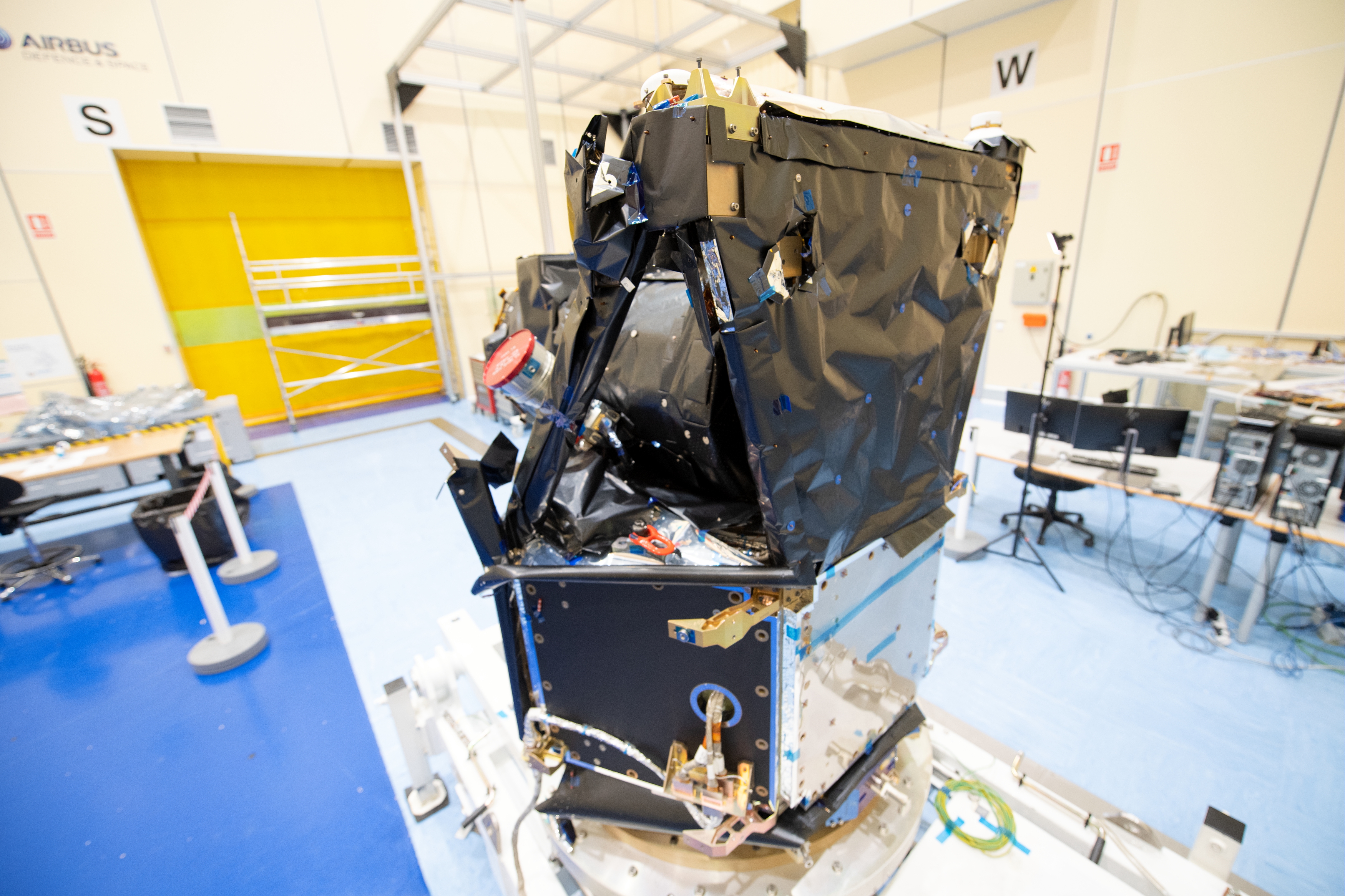 The CHaracterising ExOPlanet Satellite, CHEOPS, in the clean room at Airbus Defence and Space Spain, Madrid, in February 2019. The satellite was declared ready to fly and will target the period between 15 October and 14 November for launch. CHEOPS will make observations of exoplanet-hosting stars to measure small changes in their brightness due to the transit of a planet across the star's disc, targeting in particular stars hosting planets in the Earth-to-Neptune size range. The information will enable precise measurements of the sizes of the orbiting planets to be made: combined with measurements of the planet masses, this will provide an estimate of their mean density – a first step to characterising planets outside our Solar System.