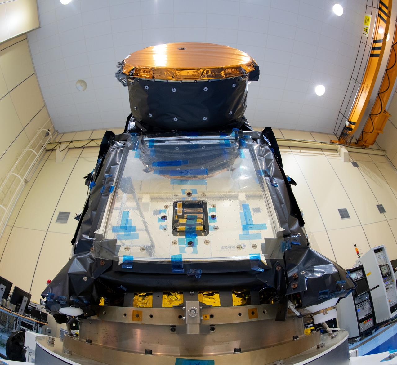 The CHaracterising ExOPlanet Satellite, CHEOPS, in the clean room at Airbus Defence and Space Spain, Madrid, in February 2019. The satellite was declared ready to fly and will target the period between 15 October and 14 November for launch. CHEOPS will make observations of exoplanet-hosting stars to measure small changes in their brightness due to the transit of a planet across the star's disc, targeting in particular stars hosting planets in the Earth-to-Neptune size range. The information will enable precise measurements of the sizes of the orbiting planets to be made: combined with measurements of the planet masses, this will provide an estimate of their mean density – a first step to characterising planets outside our Solar System.