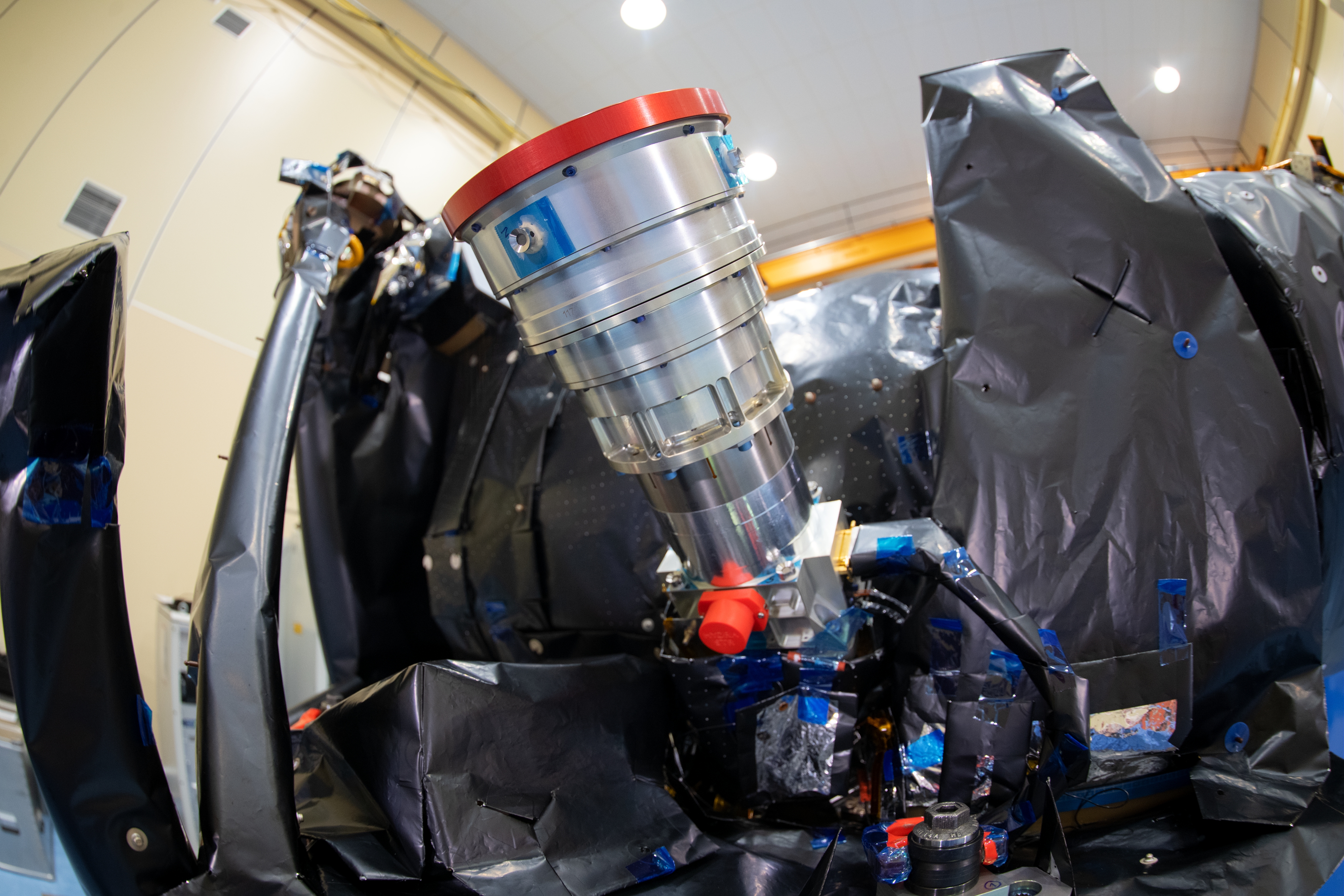 The CHaracterising ExOPlanet Satellite, CHEOPS, in the clean room at Airbus Defence and Space Spain, Madrid, in February 2019. The satellite was declared ready to fly and will target the period between 15 October and 14 November for launch. CHEOPS will make observations of exoplanet-hosting stars to measure small changes in their brightness due to the transit of a planet across the star's disc, targeting in particular stars hosting planets in the Earth-to-Neptune size range. The information will enable precise measurements of the sizes of the orbiting planets to be made: combined with measurements of the planet masses, this will provide an estimate of their mean density – a first step to characterising planets outside our Solar System.