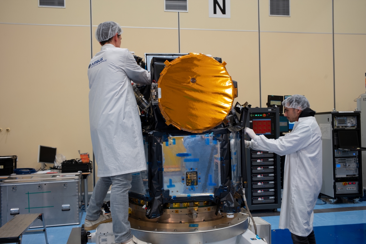 The CHaracterising ExOPlanet Satellite, CHEOPS, in the clean room at Airbus Defence and Space Spain, Madrid, in February 2019. The satellite was declared ready to fly and will target the period between 15 October and 14 November for launch. CHEOPS will make observations of exoplanet-hosting stars to measure small changes in their brightness due to the transit of a planet across the star's disc, targeting in particular stars hosting planets in the Earth-to-Neptune size range. The information will enable precise measurements of the sizes of the orbiting planets to be made: combined with measurements of the planet masses, this will provide an estimate of their mean density – a first step to characterising planets outside our Solar System.